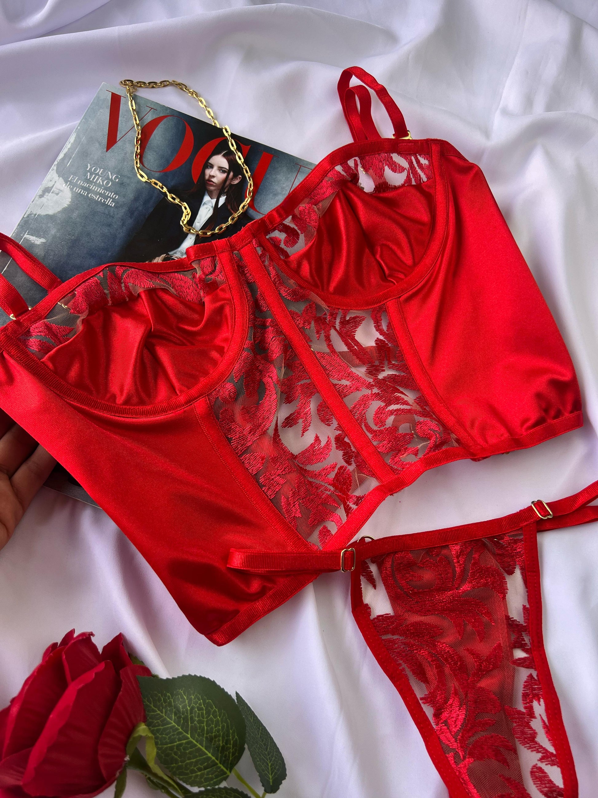 Característica: Crop top bordado con tela satinada, espalda graduable, el panty se ajusta perfectamente a le medida (Disponible por tallas) Debes basarte en la talla que uses normalmente en brasier.