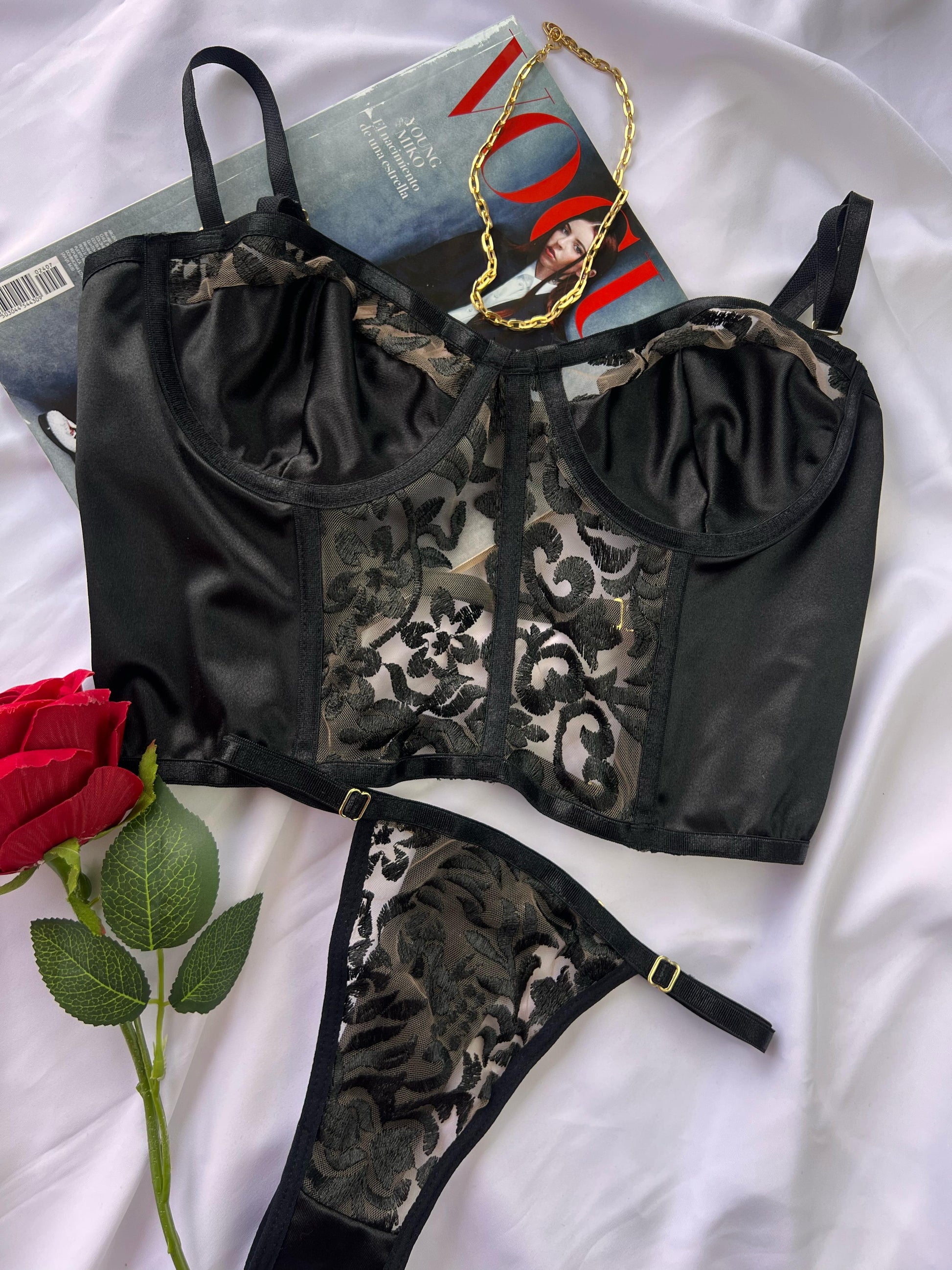 ¡Haz una declaración de moda con nuestro set de lencería negro! Con un crop top bordado y un diseño exclusivo, es perfecto para usar tanto en el exterior como en tu día a día. Combínalo con tu mejor outfit y añade un toque elegante a tu estilo. ¡Consíguelo ahora en nuestro catálogo!