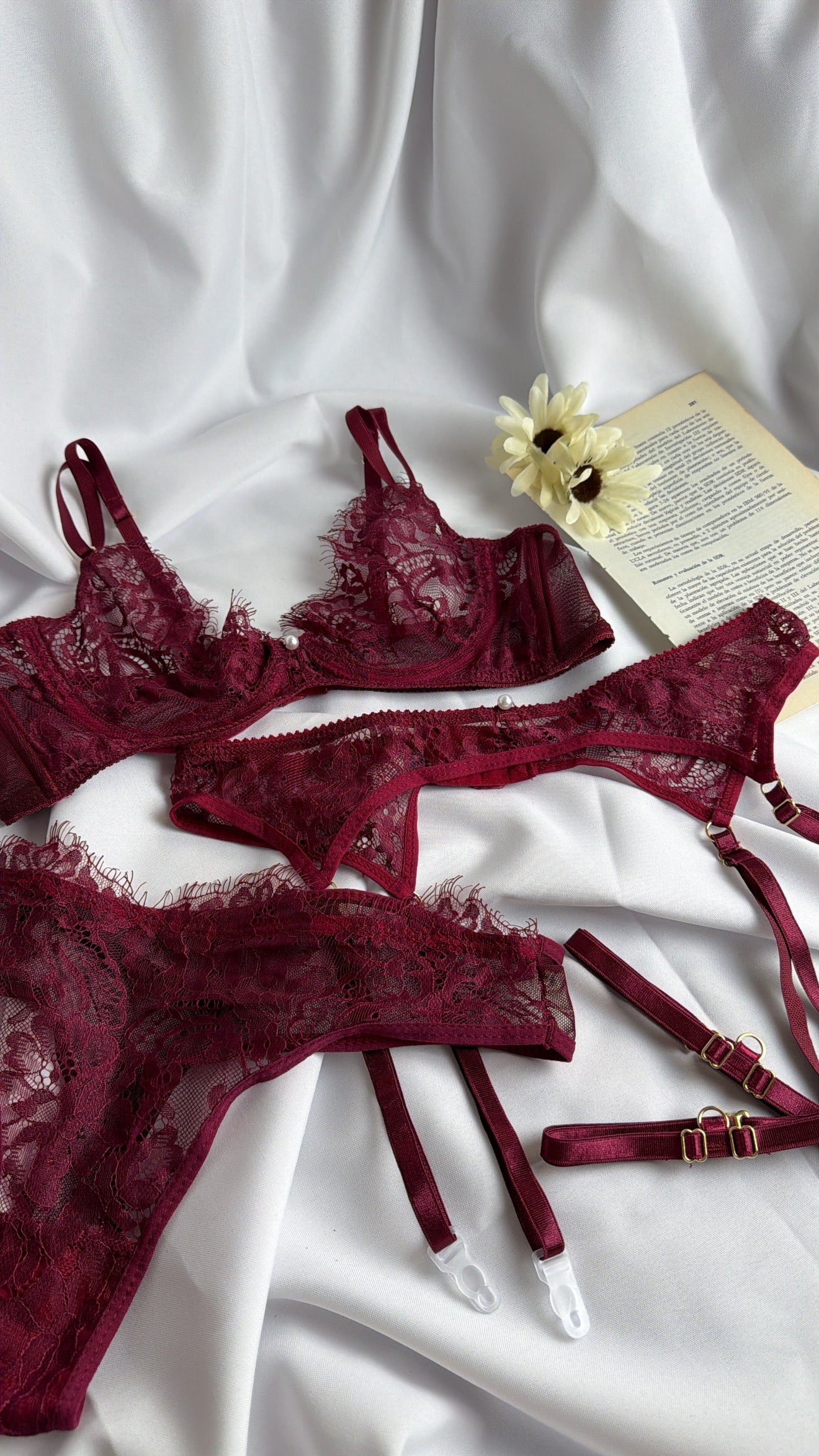 Característica: Bra en tela de encaje, con varilla para dar mayor soporte a tu busto, panty en encaje y malla parte de atrás, es talla única y se ajusta perfectamente a la medida. Debes basarte en la talla que uses normalmente en brasier. Incluye liguero y ligas. Tal cuál las fotos.