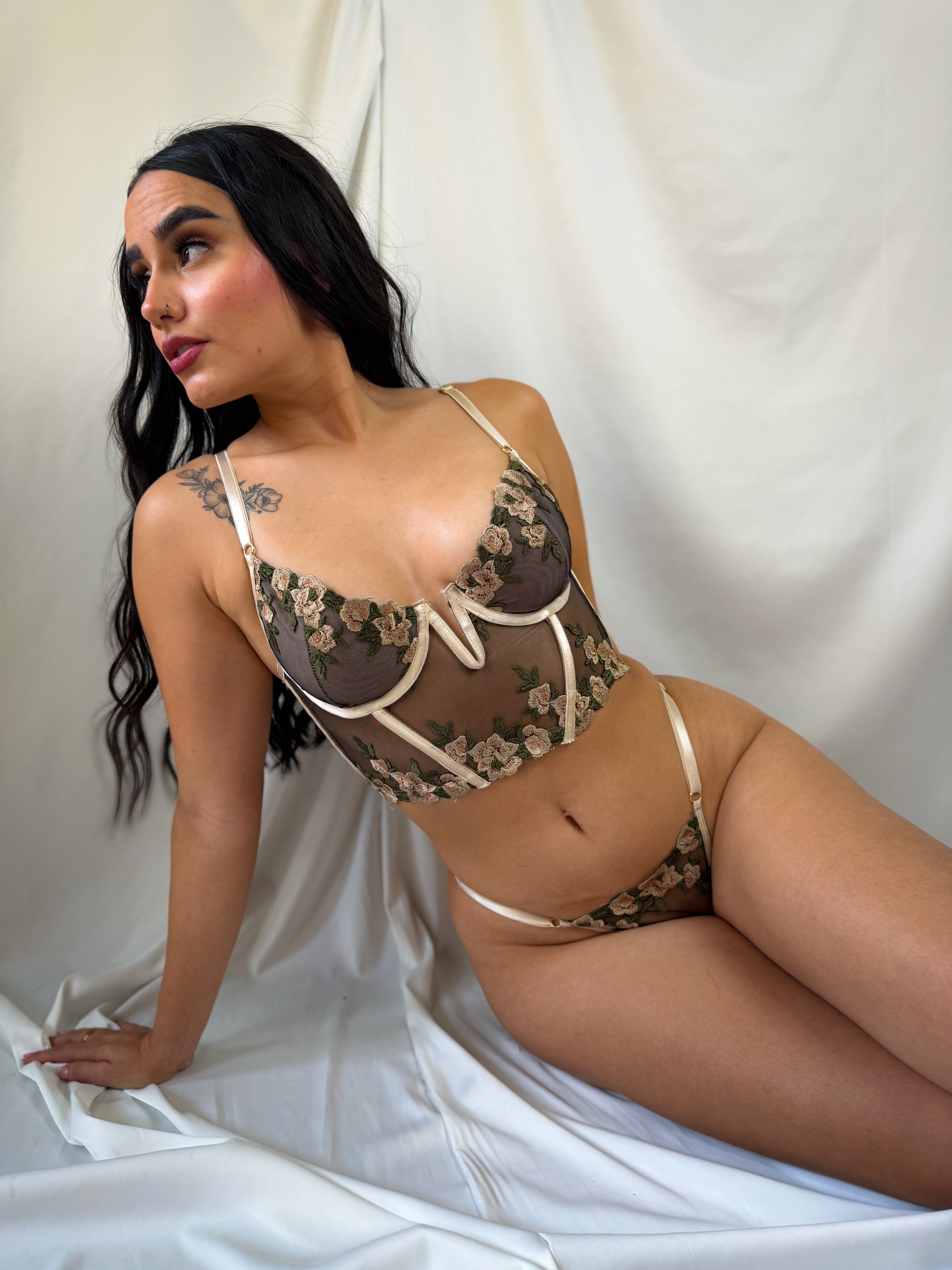 Característica: Crop top en tela de encaje con detalles bordados, copa forrada con varilla para que te realce el busto (no es transparente en esta zona) su parte de atrás es graduable y el panty es talla única. Se gradúa y se ajusta perfectamente a la medida. (Disponible por tallas) Debes basarte en la talla que uses normalmente en brasier.